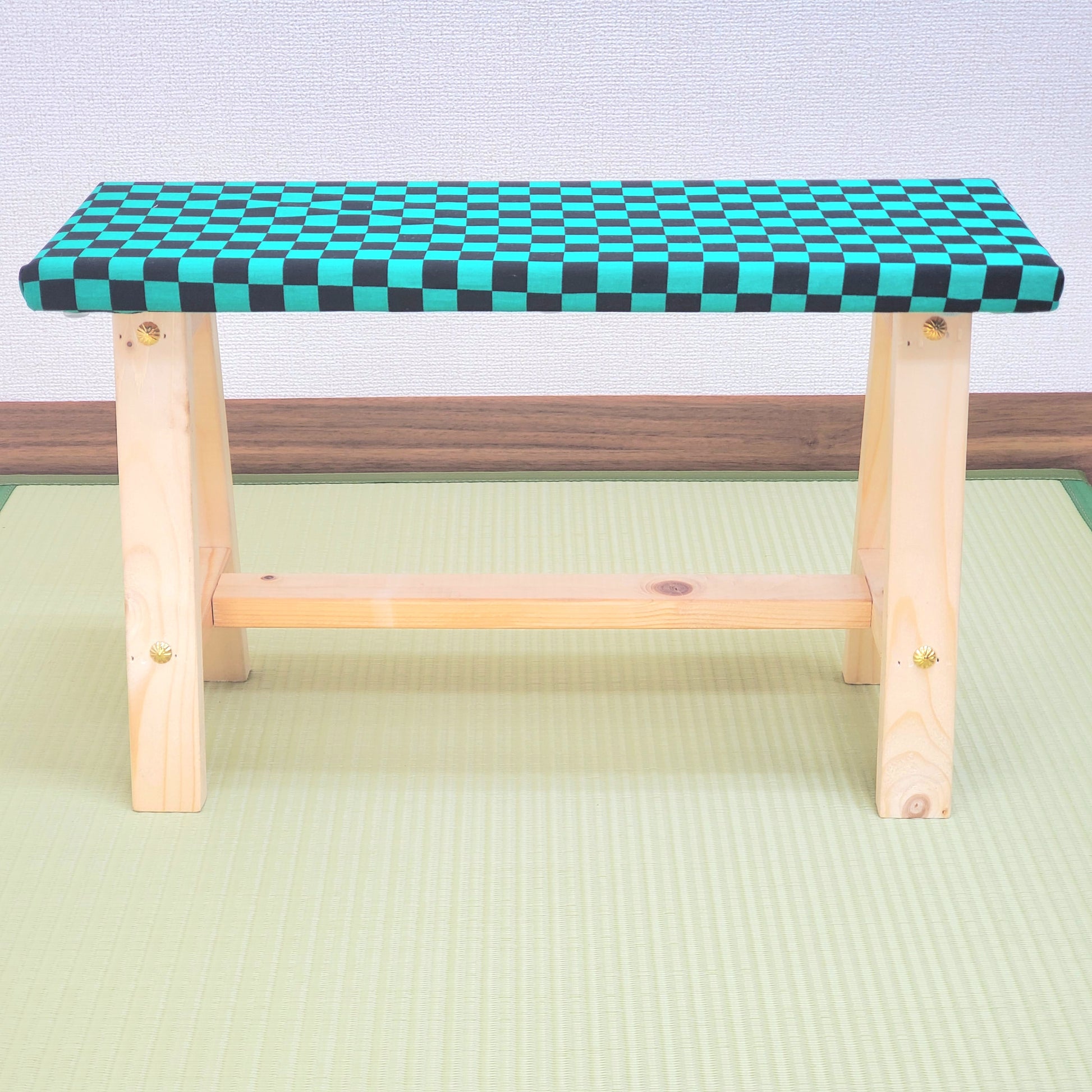 Bring a touch of Japan into your space with this beautifully handcrafted wooden display bench. The top is wrapped in traditional wagara (Japanese pattern) fabric, adding a vibrant and authentic aesthetic. Ideal for placing flower vases, ornaments, or as a unique interior accent.