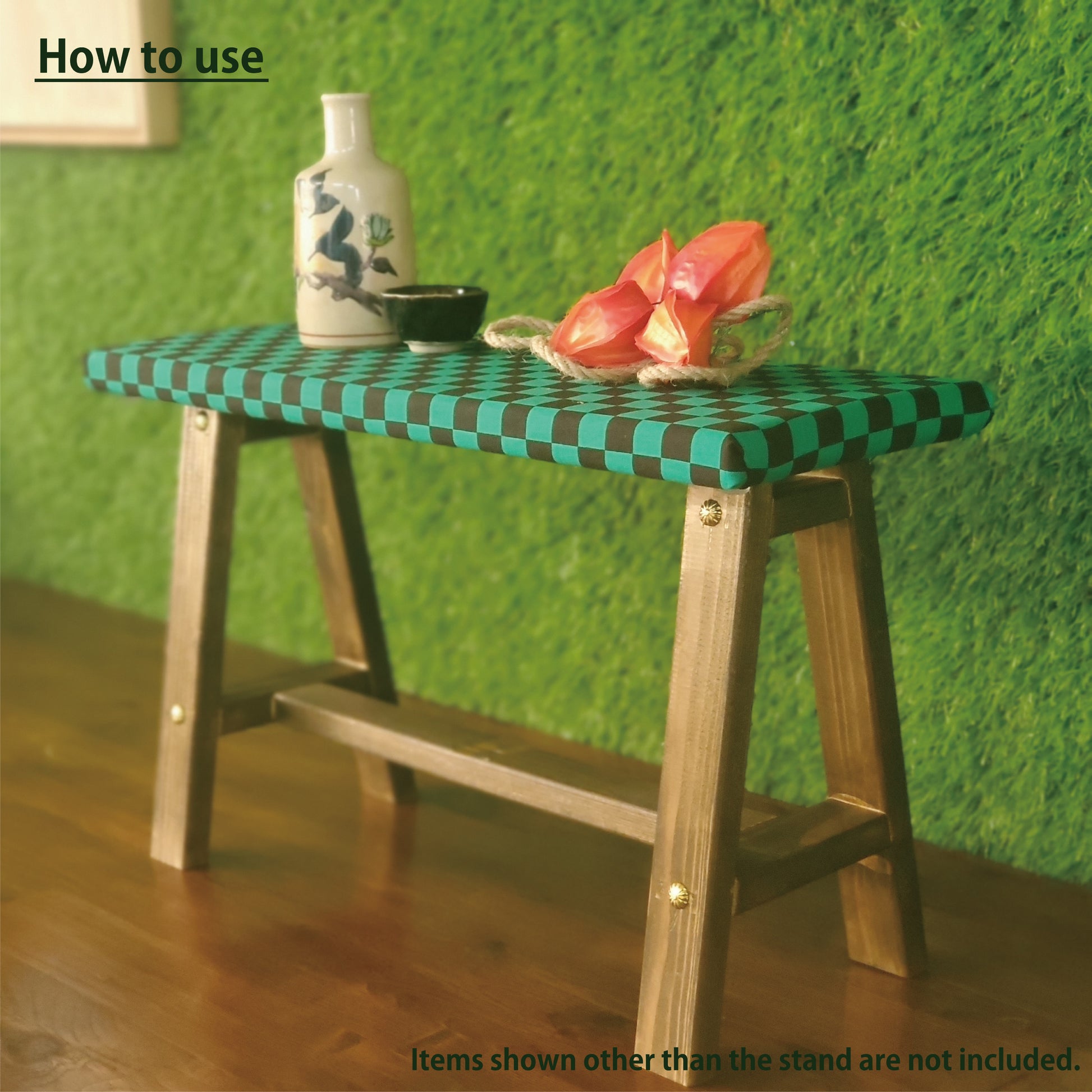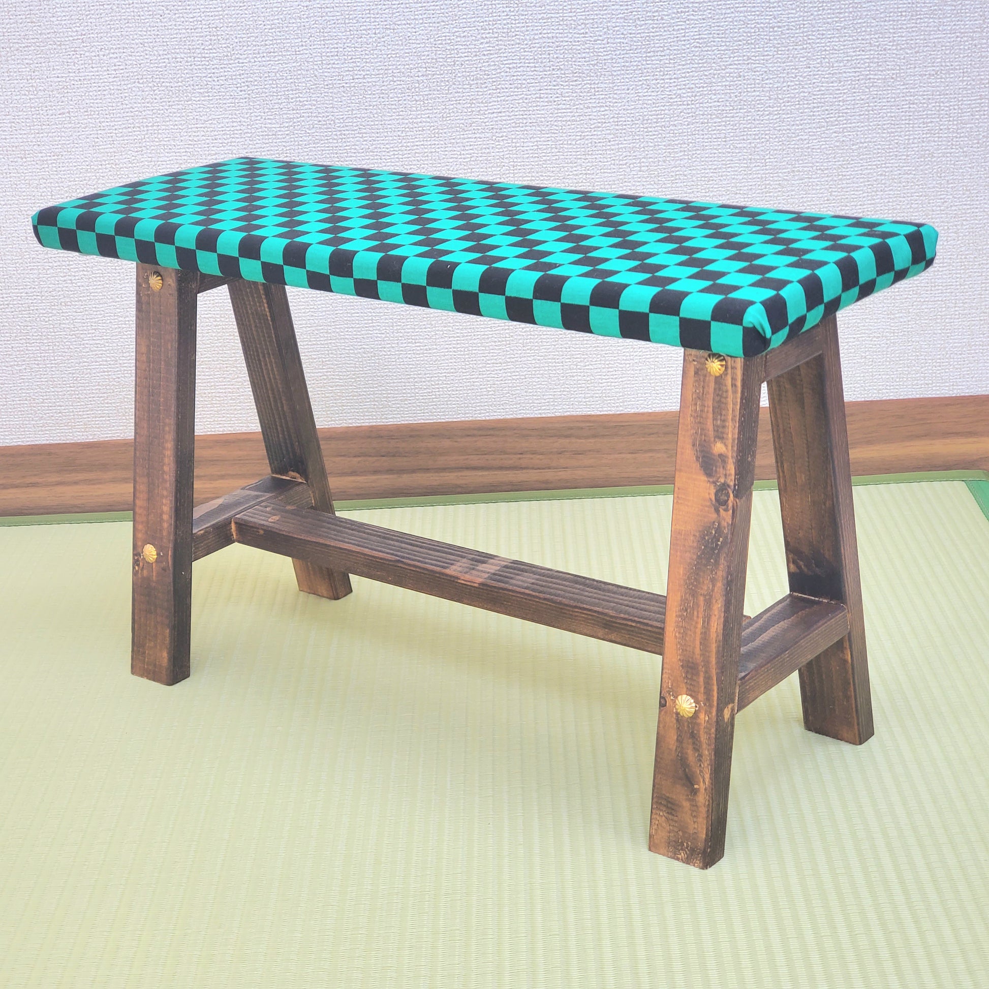 Bring a touch of Japan into your space with this beautifully handcrafted wooden display bench. The top is wrapped in traditional wagara (Japanese pattern) fabric, adding a vibrant and authentic aesthetic. Ideal for placing flower vases, ornaments, or as a unique interior accent.